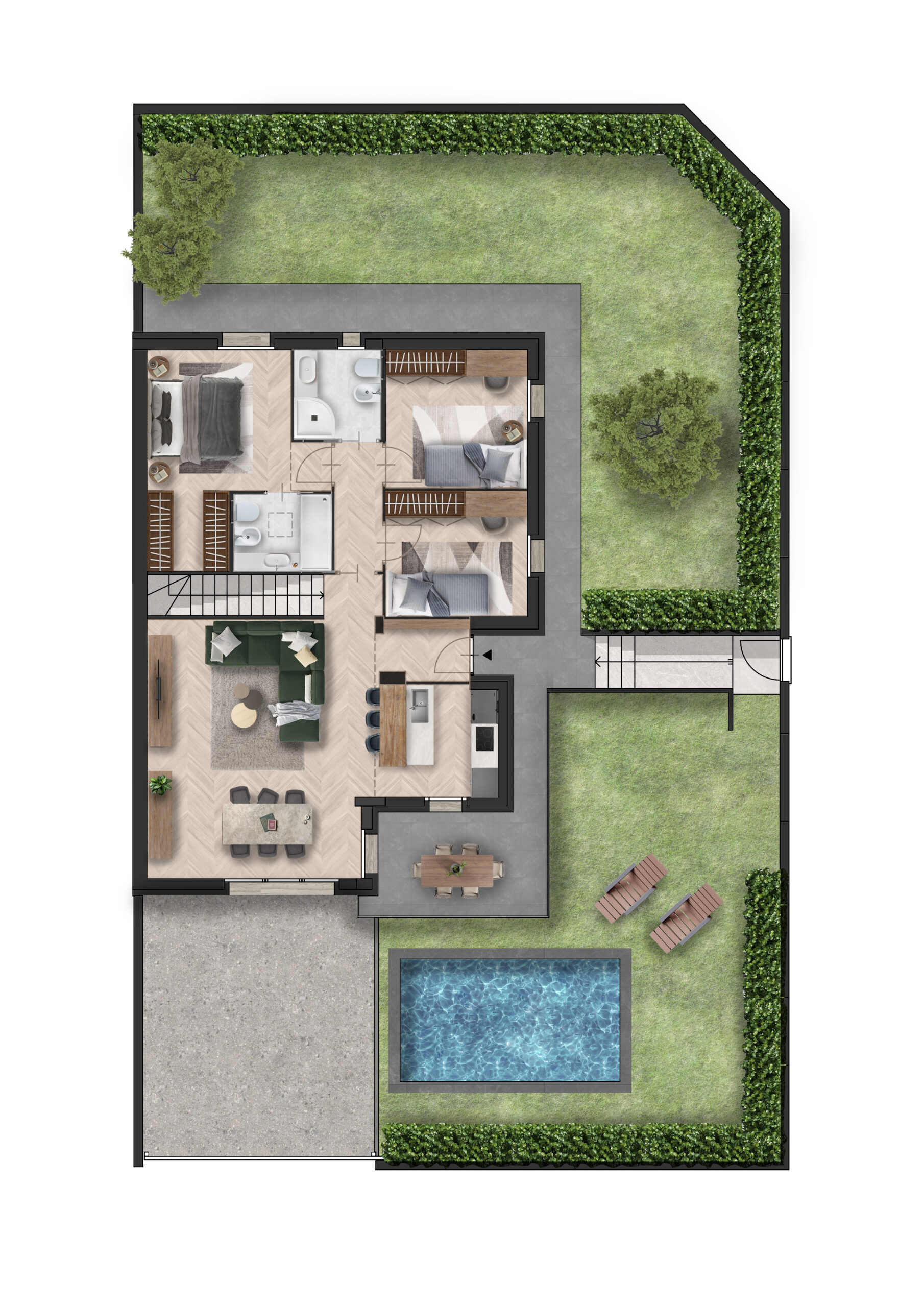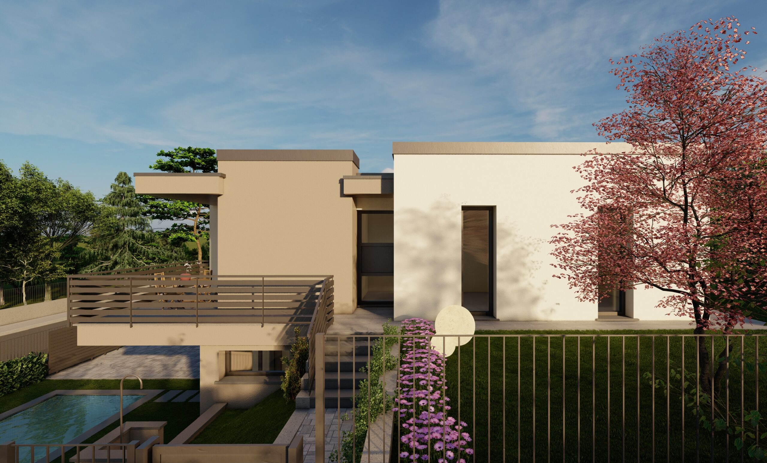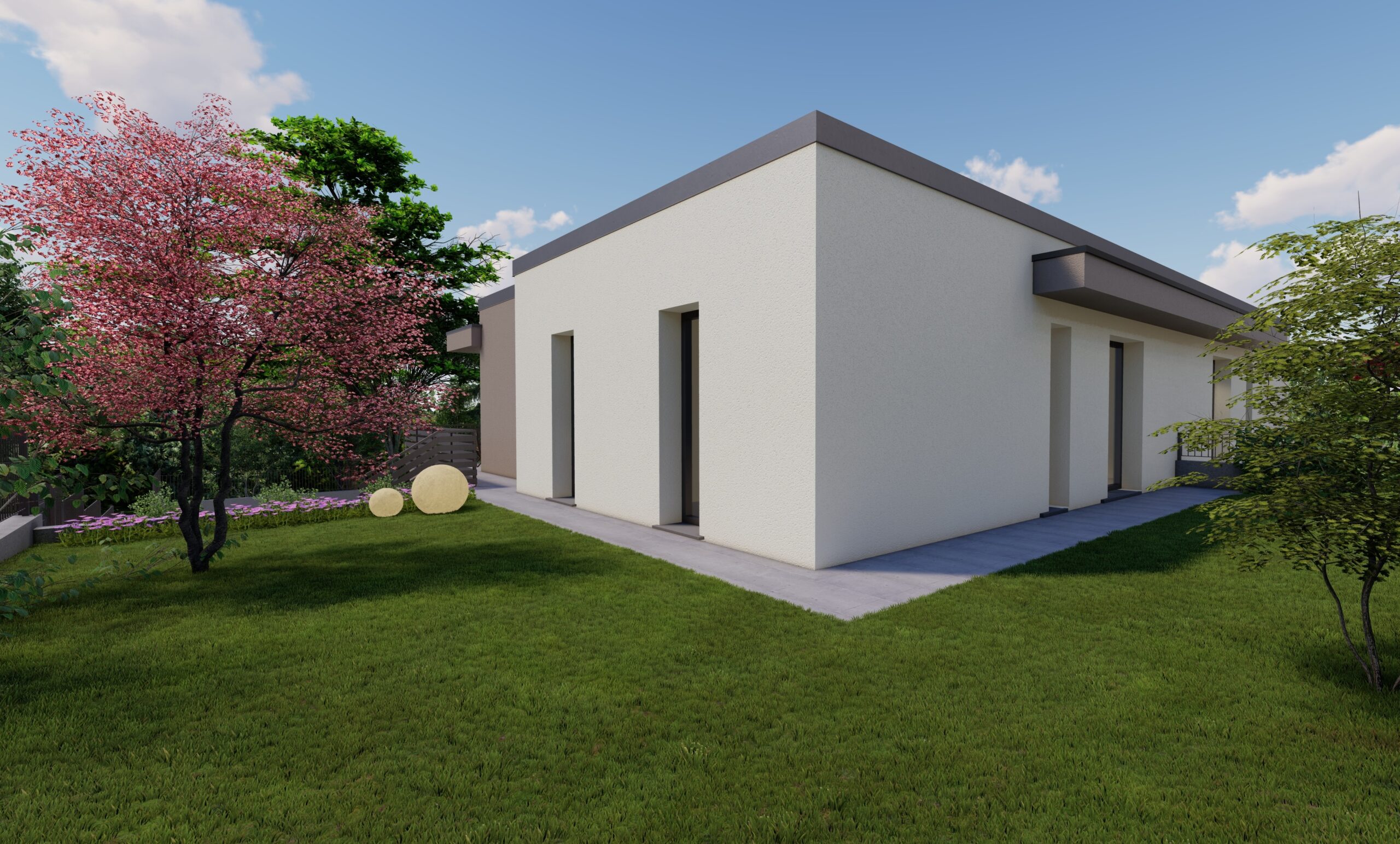 Gli spazi esterni includono un giardino privato su doppio livello e di corrette dimensioni, perfetto per trascorrere momenti di relax all’aperto senza richiedere troppa manutenzione.