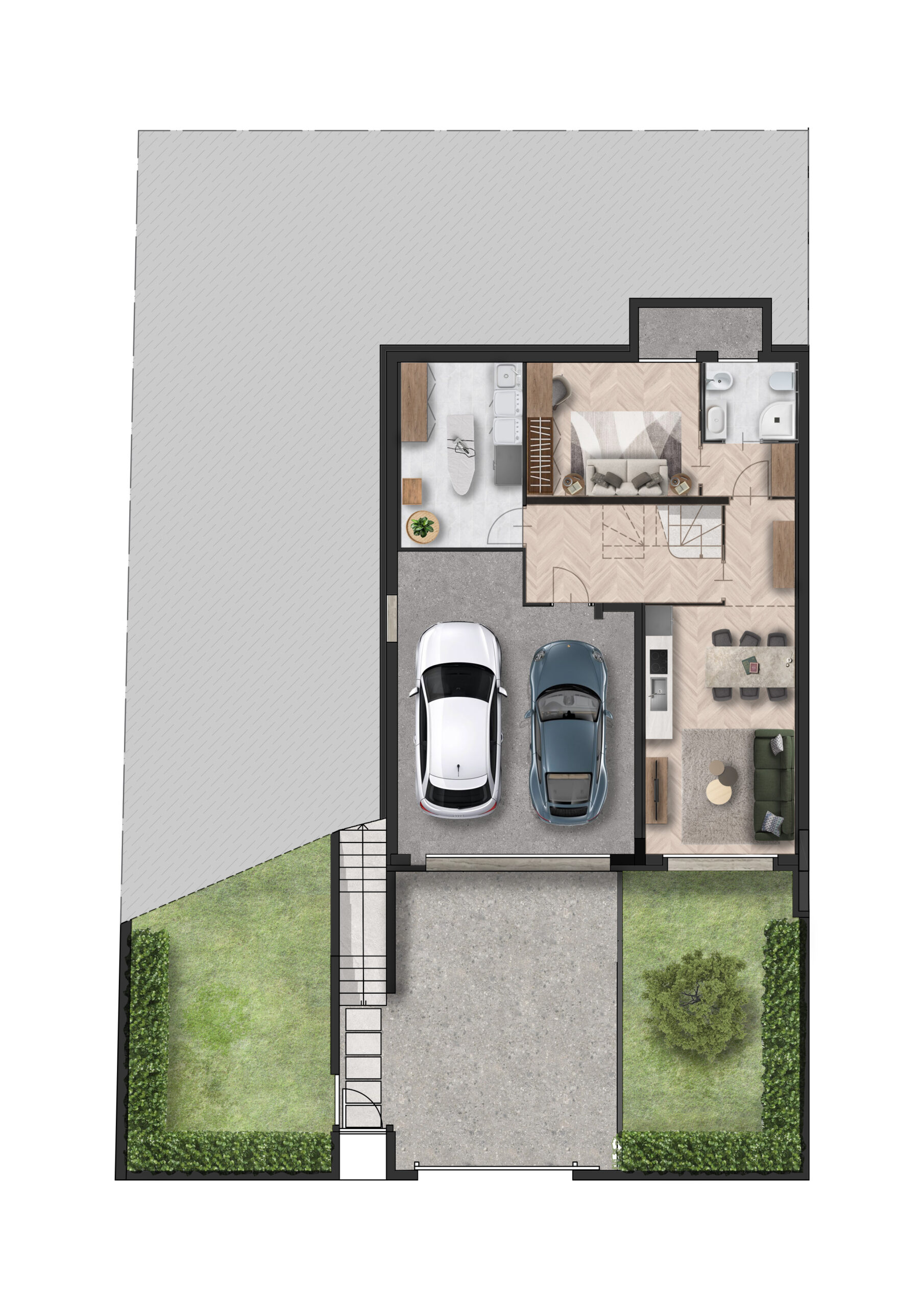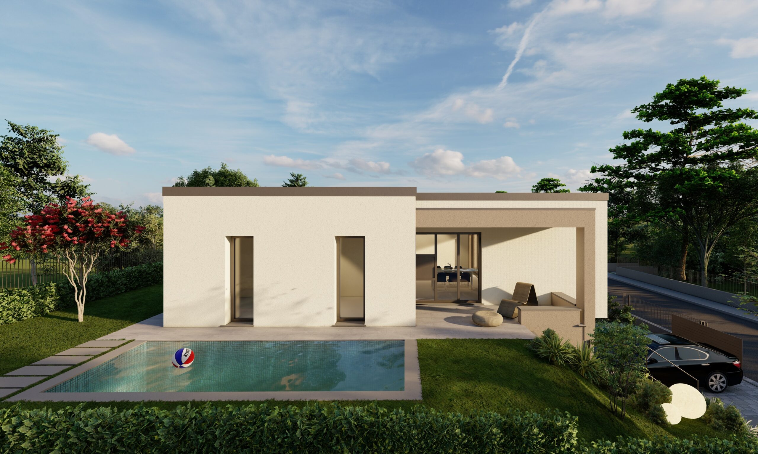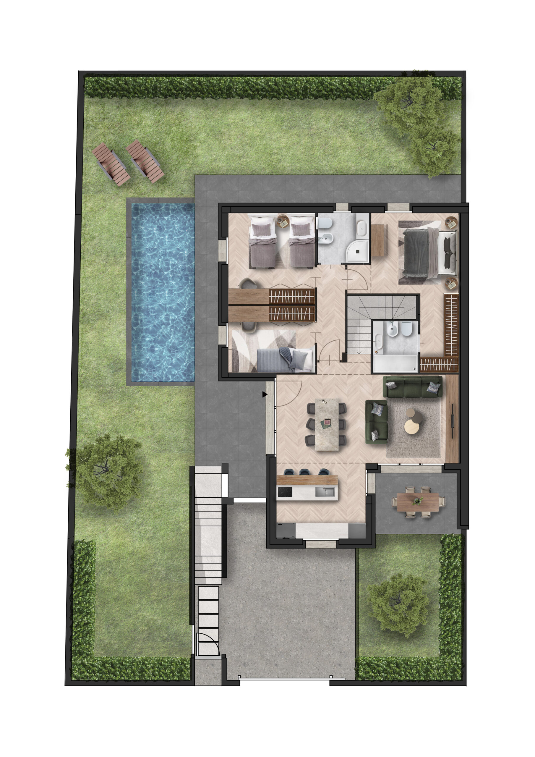Gli spazi esterni includono un giardino privato su doppio livello e di corrette dimensioni, perfetto per trascorrere momenti di relax all’aperto senza richiedere troppa manutenzione.